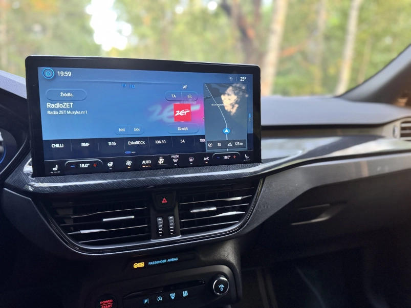- Plastikowa strona mocy – choć ergonomia jest świetna, a duży ekran robi wrażenie, wciąż czuć, że to „tylko” Focus. Twarde plastiki na boczkach drzwi czy w dolnej części deski rozdzielczej przypominają, że pieniądze poszły w mechanikę, a nie w luksusowe wykończenie. Coś za coś.